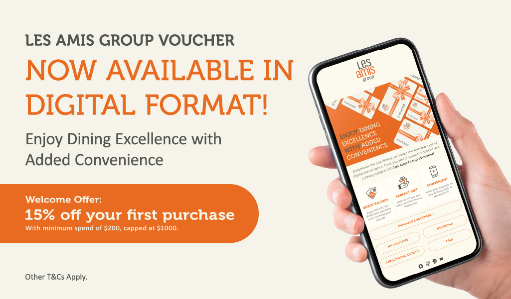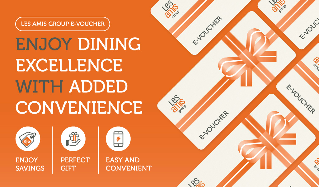 Our e-vouchers are available in $25, $50 and $100 denominations, and can be used at participating outlets under Les Amis Group. All e-vouchers are valid for a 6-month period and are great for personal use or corporate gifts.
